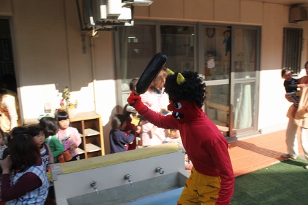 出てきた鬼に驚く子ども達!! 勇気を振り絞って豆をまく子や、泣きだす子など様々でした☆頑張って鬼を退治した後は、豆を食べてお腹の中にいる鬼も退治しました!5歳児は保育園の各部屋をまわり、邪気を払い、無病息災を願いました☆ おやつには、鬼のケーキが出てくると大喜びで皆、完食していましたよ♪